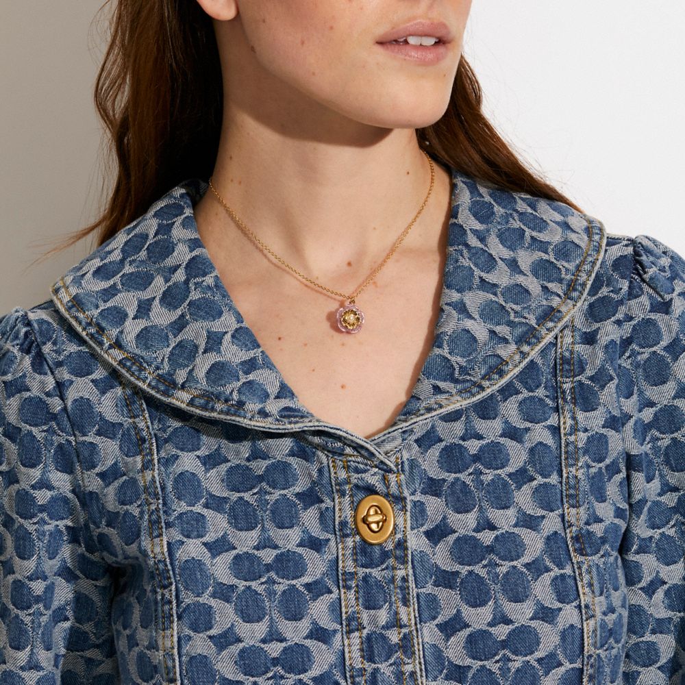 Crafted of glittery resin for a touch of shine, our prairie-inspired Tea Rose dangles on this delicate chain necklace. Detailed with our Signature and a pearl cabochon, wear it long or short with the adjustable clasp.