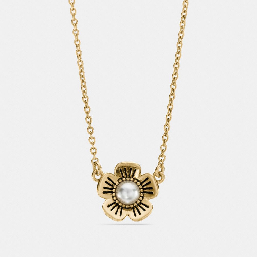 Borrowed from our bags, the prairie-inspired Tea Rose motif is turned into a delicate pendant in gold-plated sterling silver with a pearly center. Wear it alone or layer with other necklaces.