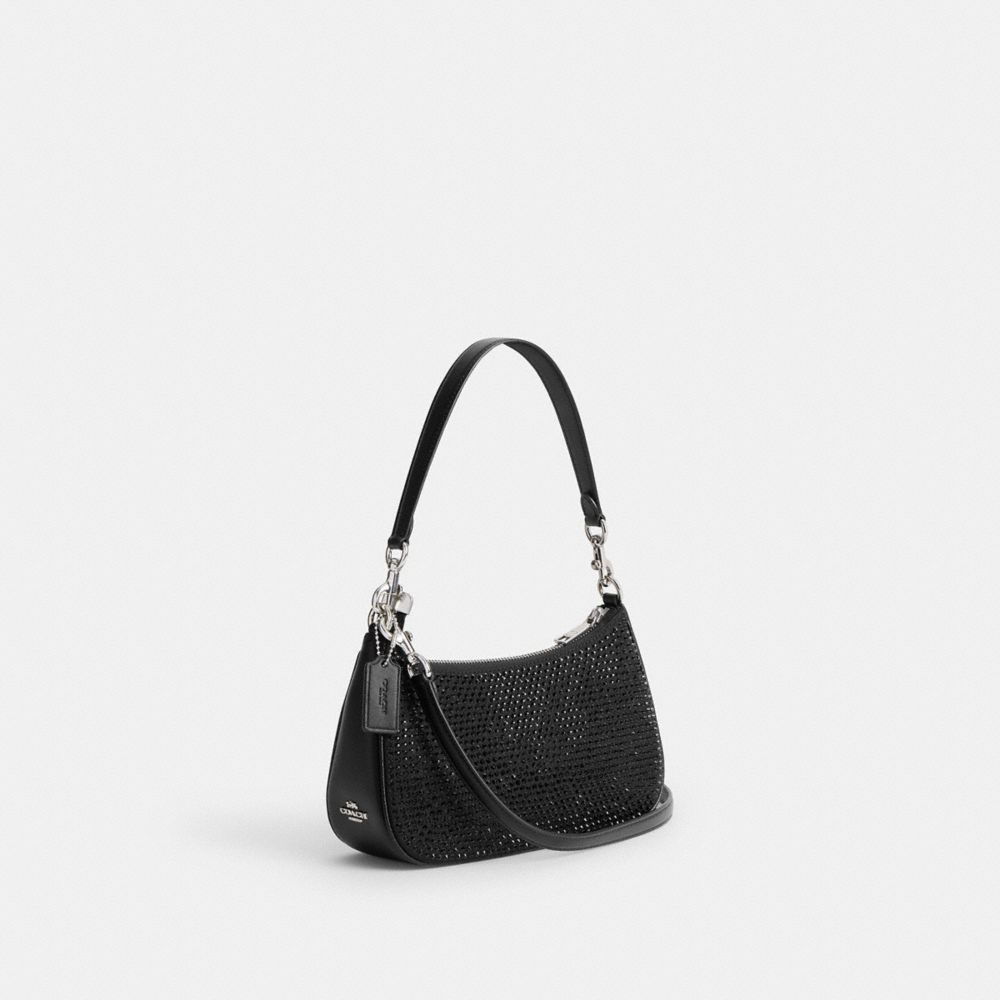 The Teri Shoulder Bag is crafted of crystal fabric and smooth leather. This shoulder bag with rhinestones is designed to carry all your essentials with ease, thanks to its roomy interior and convenient pockets. With a detachable strap, you have the option to wear it over the shoulder or as a crossbody, making it perfect for any occasion.