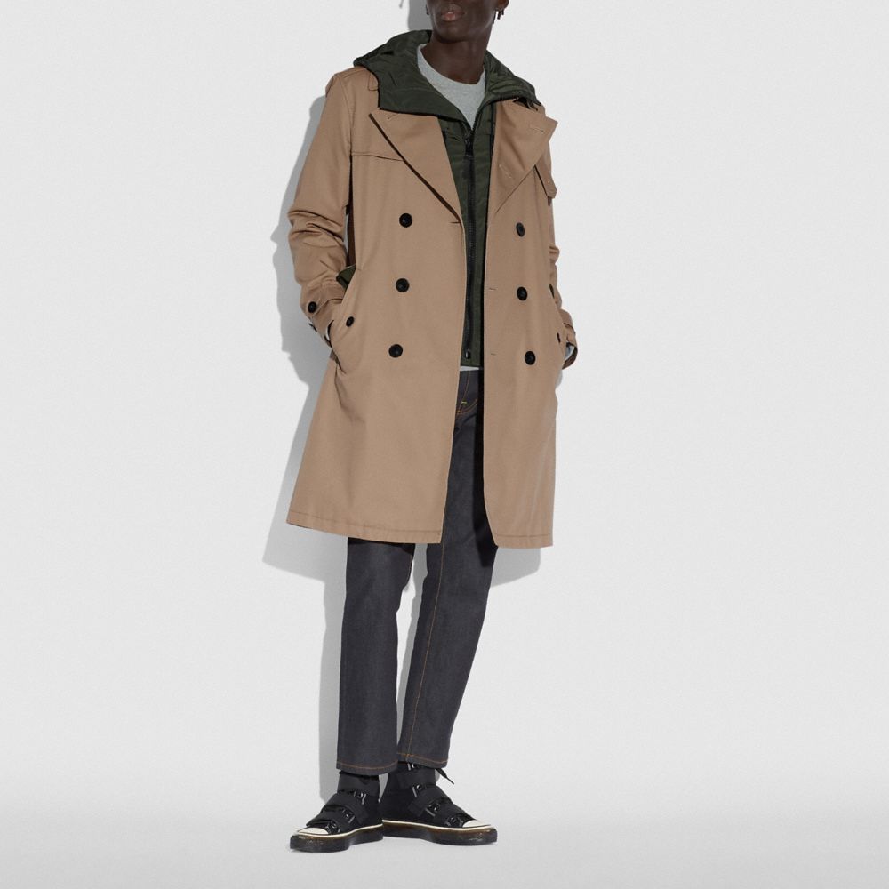 Combine iconic style with modern utility, our classic-fit, double-breasted trench coat features smooth leather details and a protective throat latch. The versatile design can be worn three ways: with the trench and hooded liner together, as a lighter weight trench or a sporty nylon vest.