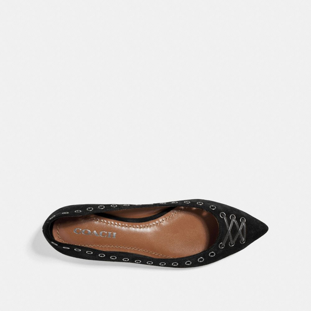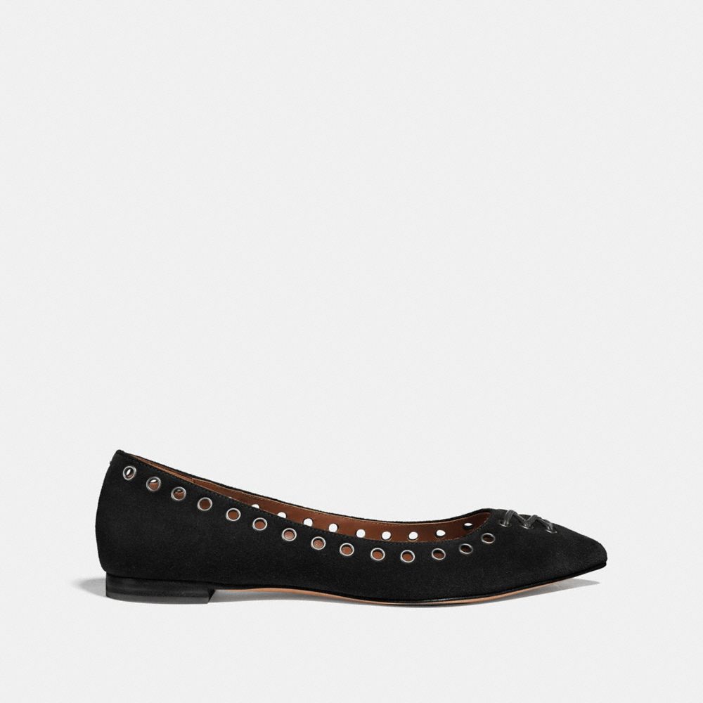 Industrial-inspired eyelets lend city appeal to this sophisticated soft suede skimmer. It's the perfect flat to pair with jeans or casual dresses.