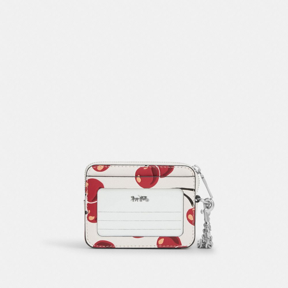 An ultra-compact essential, this Zip Card Case is crafted of smooth and novelty leather. It's the perfect size to slip into your pocket or bag, holding all your essential cards and cash with ease. The zip closure keeps everything secure, while the convenient slots organize your cards. Plus, it has a handy window to easily display your identification. To complete the look of this cherry zip card case, a chain wrist strap adds a touch of shine. It's the ultimate, lightweight companion for keeping your necessities close at hand.